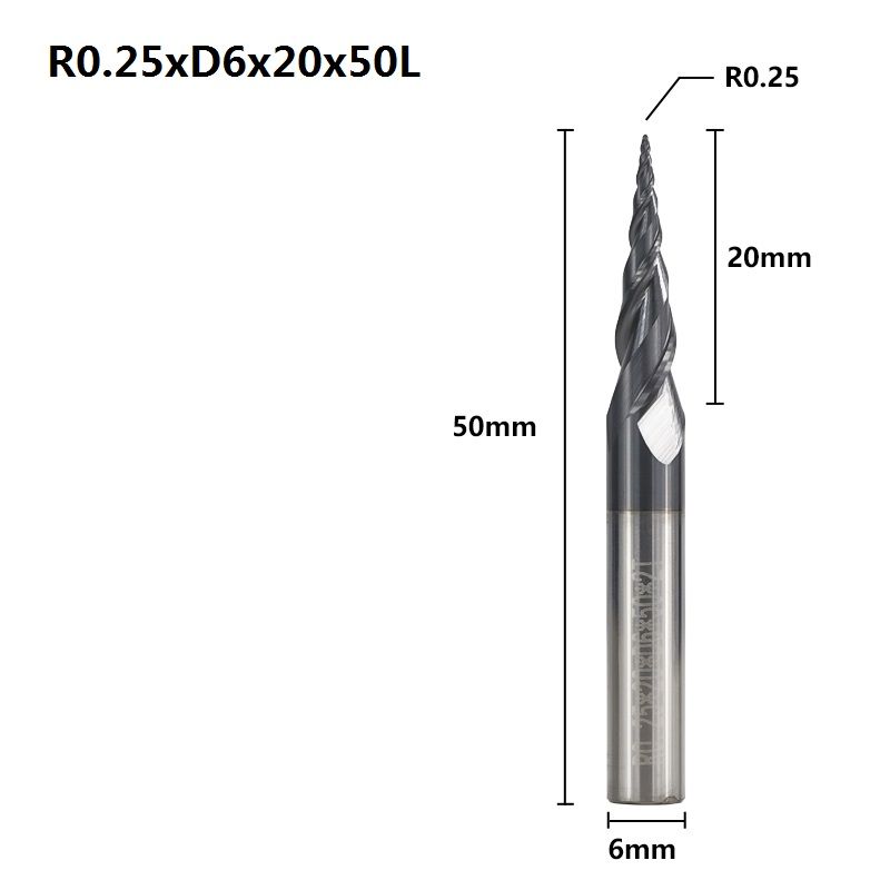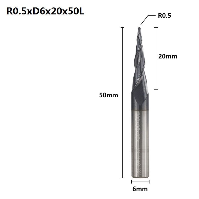 R0.25xD6x20x50L Fraise à bout conique en carbure de tungstène R0.25-R2.0 CNC, fraises pour bois et métal, outil de fraisage CNC ""Nipseyteko