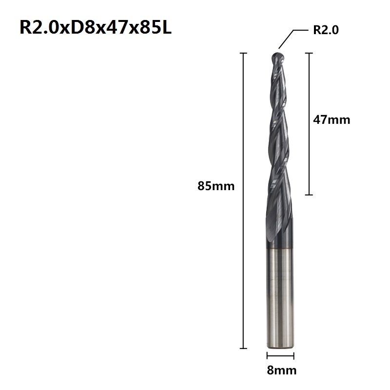 R2.0xD8x47x85L Fraise à bout conique en carbure de tungstène R0.25-R2.0 CNC, fraises pour bois et métal, outil de fraisage CNC ""Nipseyteko
