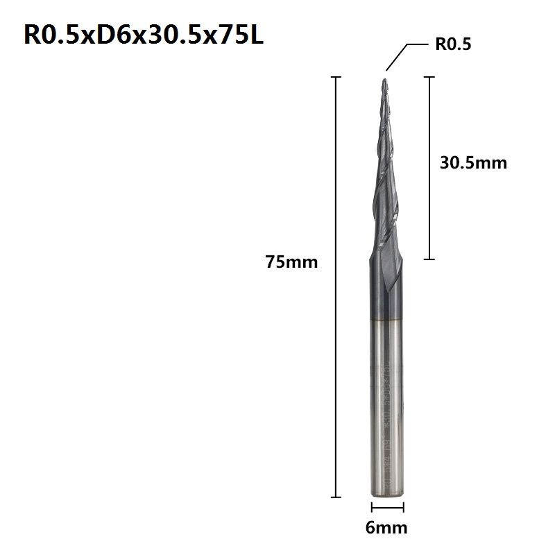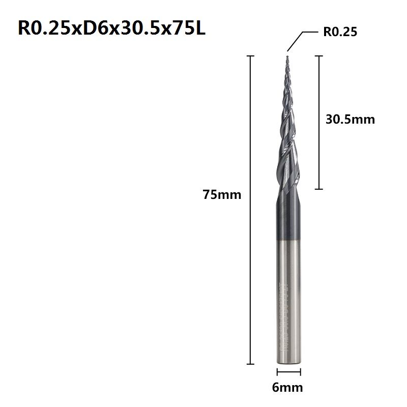 R0.25xD6x30.5x75L Fraise à bout conique en carbure de tungstène R0.25-R2.0 CNC, fraises pour bois et métal, outil de fraisage CNC ""Nipseyteko