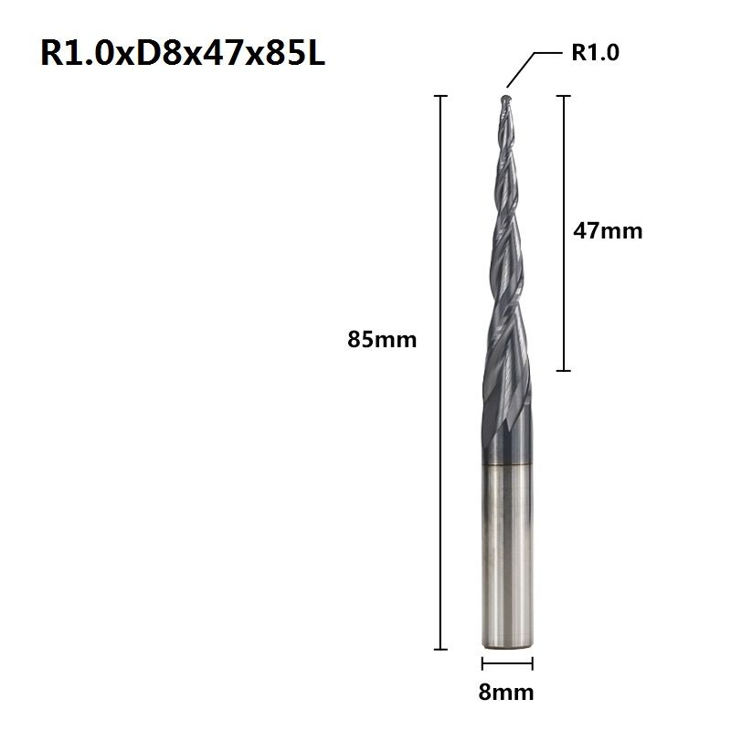 R1.0xD8x47x85L Fraise à bout conique en carbure de tungstène R0.25-R2.0 CNC, fraises pour bois et métal, outil de fraisage CNC ""Nipseyteko