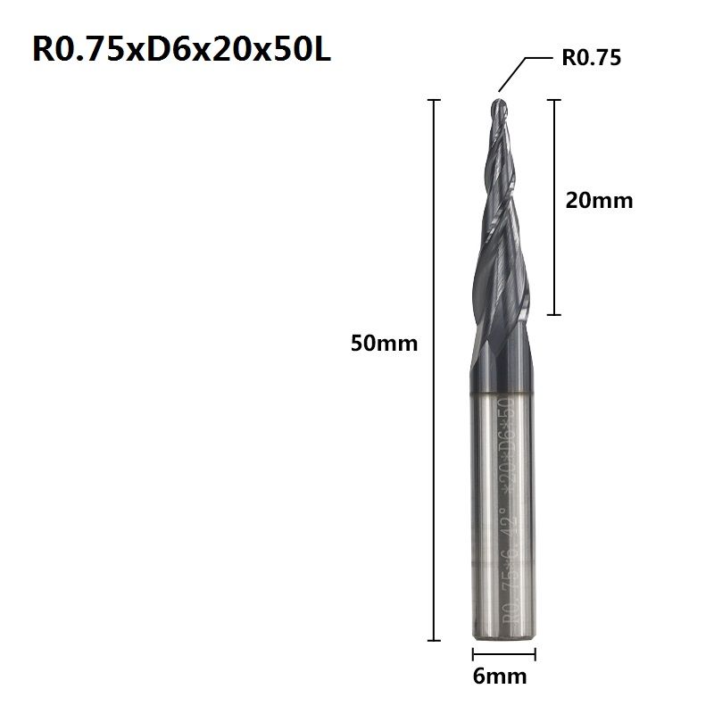 R0.75xD6x20x50L Fraise à bout conique en carbure de tungstène R0.25-R2.0 CNC, fraises pour bois et métal, outil de fraisage CNC ""Nipseyteko