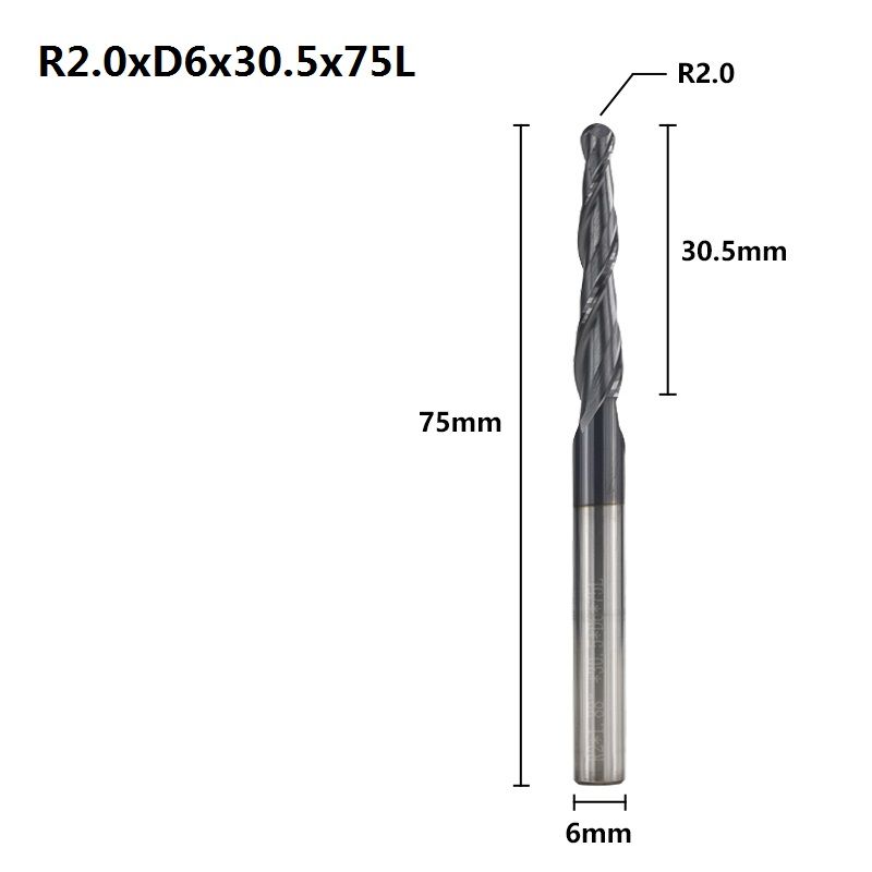 R2.0xD6x30.5x75L Fraise à bout conique en carbure de tungstène R0.25-R2.0 CNC, fraises pour bois et métal, outil de fraisage CNC ""Nipseyteko