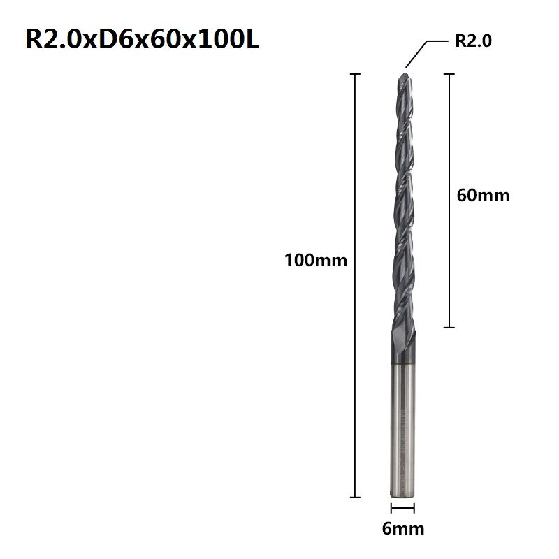 R2.0xD6x60x100L Fraise à bout conique en carbure de tungstène R0.25-R2.0 CNC, fraises pour bois et métal, outil de fraisage CNC ""Nipseyteko