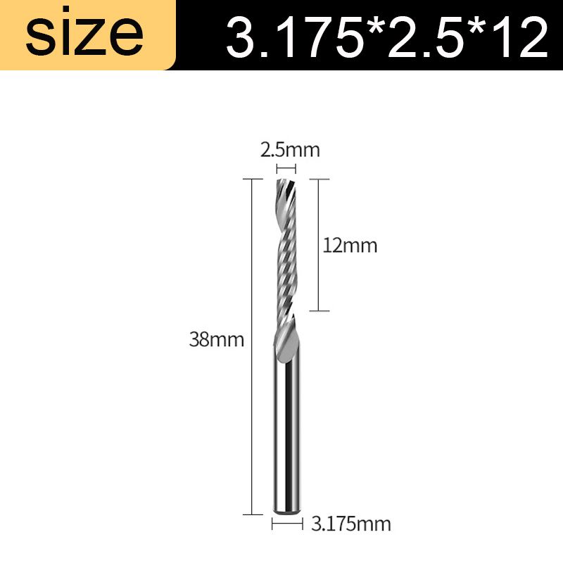 3.175x2.5x12 5pcs Fraises à spirale en carbure de tungstène, 1 cannelure, outils CNC pour bois acrylique MDF 3.175 4 6 8mm ""Nipseyteko