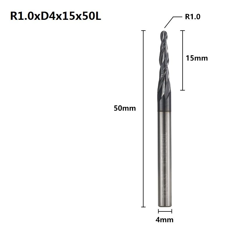 R1.0xD4x15x50L Fraise à bout conique en carbure de tungstène R0.25-R2.0 CNC, fraises pour bois et métal, outil de fraisage CNC ""Nipseyteko