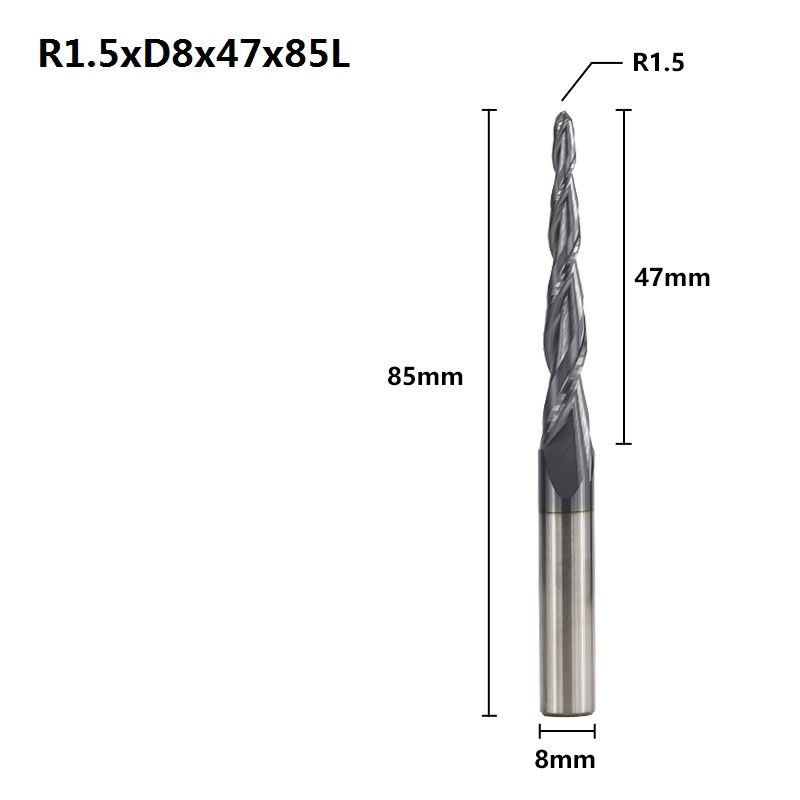 R1.5xD8x47x85L Fraise à bout conique en carbure de tungstène R0.25-R2.0 CNC, fraises pour bois et métal, outil de fraisage CNC ""Nipseyteko