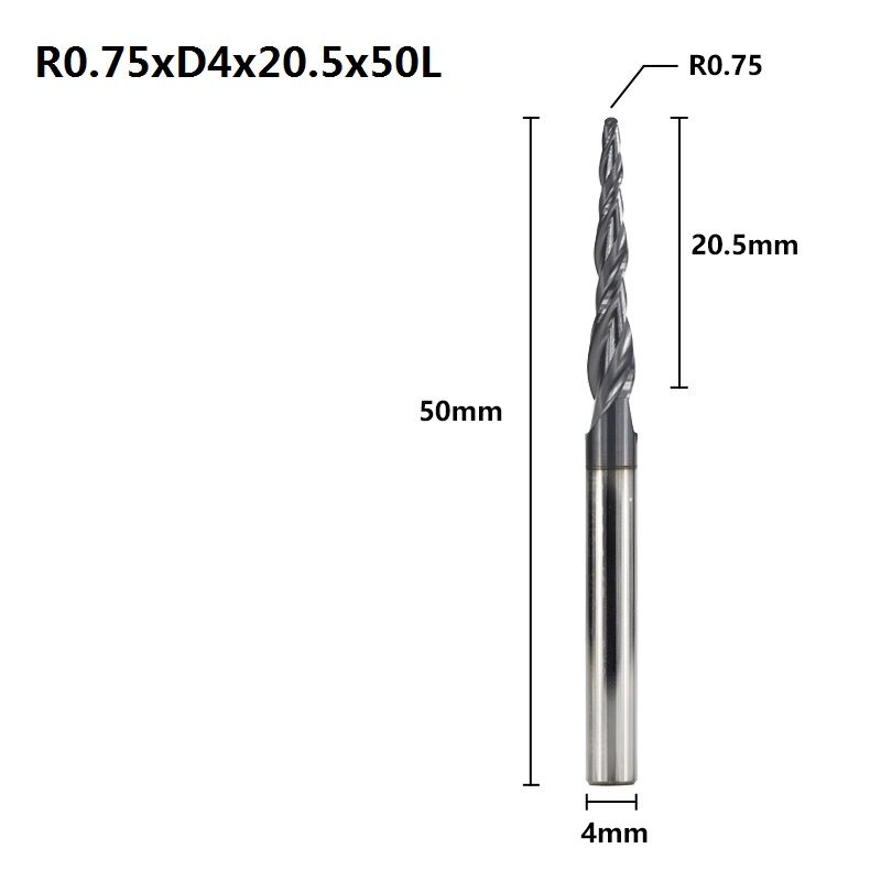 R0.75xD4x20.5x50L Fraise à bout conique en carbure de tungstène R0.25-R2.0 CNC, fraises pour bois et métal, outil de fraisage CNC ""Nipseyteko