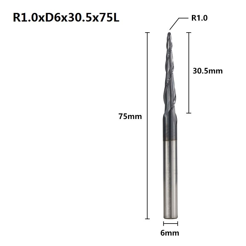 R1.0xD6x30.5x75L Fraise à bout conique en carbure de tungstène R0.25-R2.0 CNC, fraises pour bois et métal, outil de fraisage CNC ""Nipseyteko