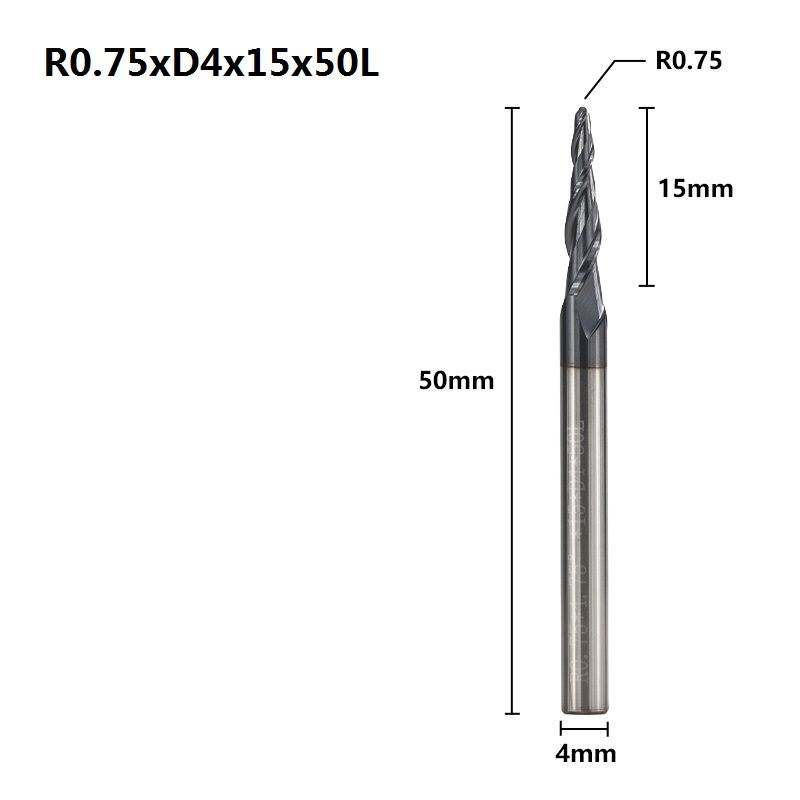 R0.75xD4x15x50L Fraise à bout conique en carbure de tungstène R0.25-R2.0 CNC, fraises pour bois et métal, outil de fraisage CNC ""Nipseyteko