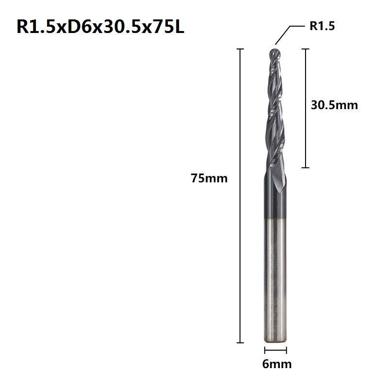 R1.5xD6x30.5x75L Fraise à bout conique en carbure de tungstène R0.25-R2.0 CNC, fraises pour bois et métal, outil de fraisage CNC ""Nipseyteko