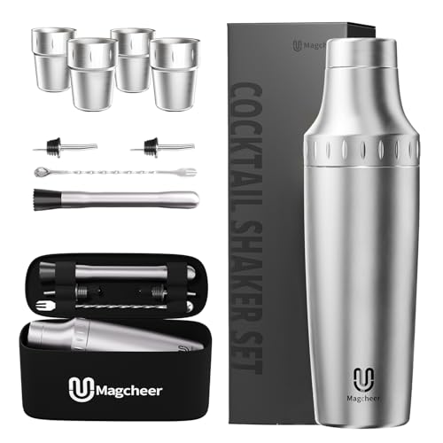 Magcheer 900ml Shaker Cocktail Isotherme Professionnel avec Tasse Empilable 4 Pièces | Kit Cocktail 9 Pièces avec Sac de Rangement | Kit Barman pour Débutants et Barmans(Argent)