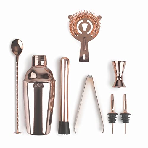 Lacor - 62182 - Kit Cocktail, Shaker, Ustensiles de cocktail, Design portable, Sans BPA, Support en bambou, Pour professionnels et amateurs, Acier inoxydable 18/10, 8 pcs, Finition cuivre