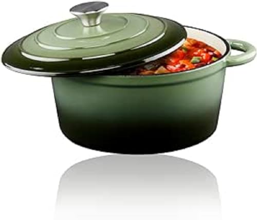Overmont Cocotte en Fonte Émaillée - Ø24 cm Casserole Antiadhésive Avec Couvercle et Maniques en Coton - Batterie de Cuisine Robuste pour Braiser Ragoûts Rôtir Pain - Vert forêt