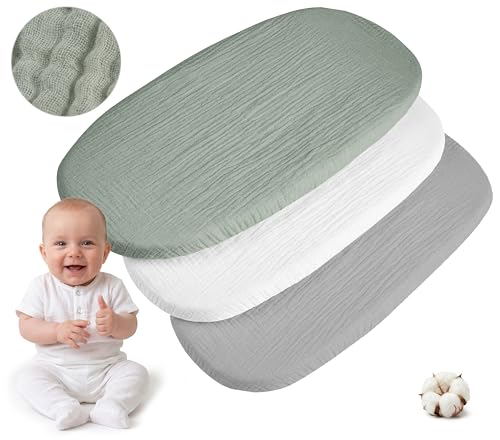 Medi Partners Drap Housse Nacelle 86x40cm Lot de 3 Draps Bebe Matelas Lit Couffin Cododo Landau - 100% Coton Mouseline Ovale Poussette Bébé Fitted Sheets Cover pour Mattress (Olive-Blanc-Gris)