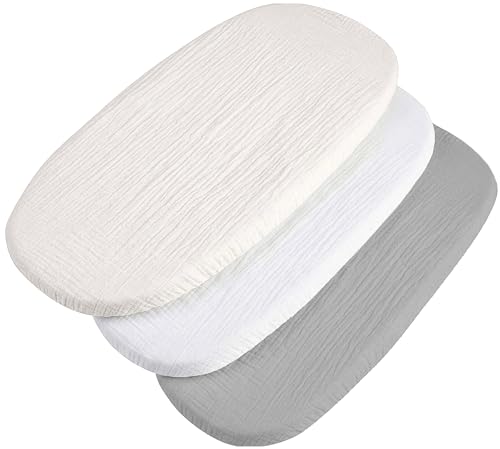 Medi Partners Drap Housse Nacelle 86x40cm Lot de 3 Draps Bebe Matelas Lit Couffin Cododo Landau - 100% Coton Mousseline Ovale Poussette Bébé Fitted Sheets Cover pour Mattress (Beige-Blanc-Gris)