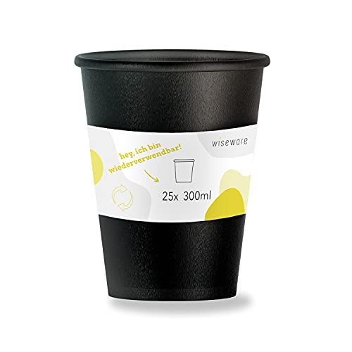 wiseware Lot de 25 gobelets de 300 ml - Réutilisables Coffee-to-Go - Sans BPA et réutilisables en plastique (PP) - Passe au lave-vaisselle - Noir - Sans couvercle