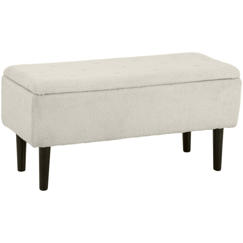 Banc coffre, bout de lit avec revêtement bouclette texturée, beige, pieds en bois noir, l 112 x 44 x 50cm