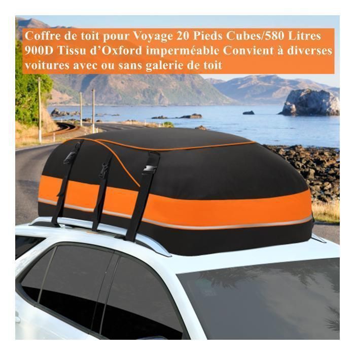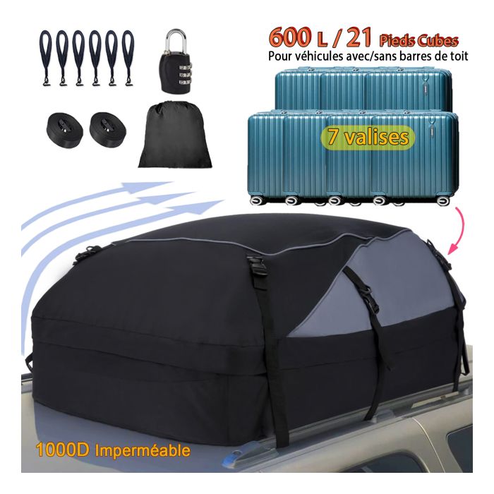 Sac de Toit Voiture - 600L - Coffre de Toit Souple 100% Imperméable pour Tous Véhicules avec/sans Barres de Toit - Muet + Cadenas