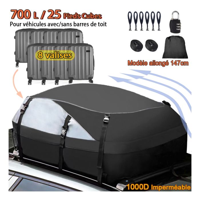 Sac de Toit Voiture - 700L/25 Pieds Cubes - Coffre de Toit Souple Imperméable pour Tous Véhicules avec/sans Barres de Toit -Cadenas