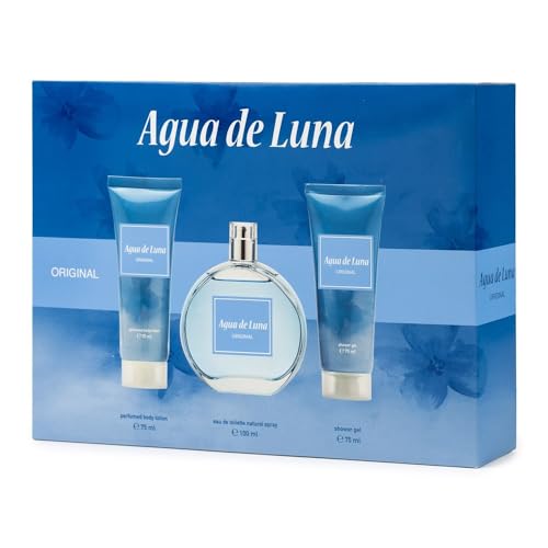AGUA DE LUNA - Cologne Original 100 ml + Gel Bain 75 ml + Lait Corps 75 ml, Coffret Cadeau Femme, Eau de Toilette Naturelle et Féminine, Arôme Floral, Parfum Frais et Longue Durée