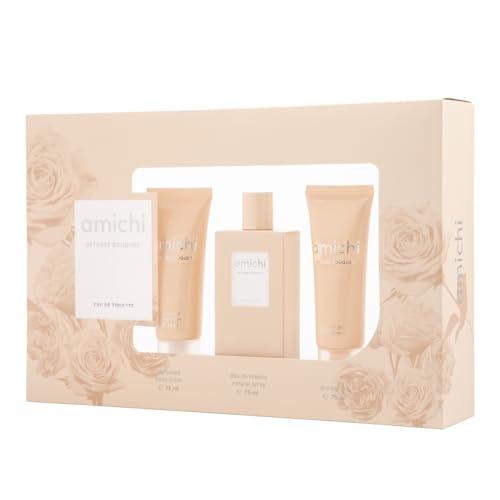 AMICHI - Eau de Cologne Bouquet Intense 75 ml + Gel de Bain + Lait Corps, Coffret Cadeau Femme, Eau de Toilette Féminine, Parfum Doux et Floral, Arôme Intense Longue Durée