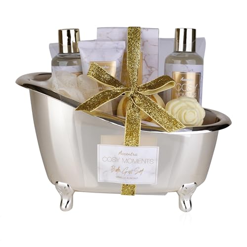 Accentra Coffret Bain et Douche COSY MOMENTS Or, Coffret Cadeau Détente pour Femme, Idéal pour un Anniversaire ou Noël, Coffret Bien-être 7 Pièces avec Mini Baignoire Décorative