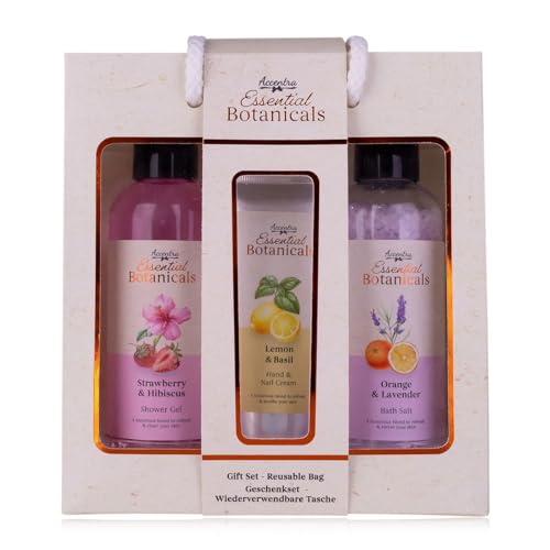 Coffret de bain Accentra ESSENTIAL BOTANICALS en pochette cadeau, comprenant un gel douche 200 ml, des sels de bain 230 g et une crème pour les mains 60 ml, coffret bien-être pour femme