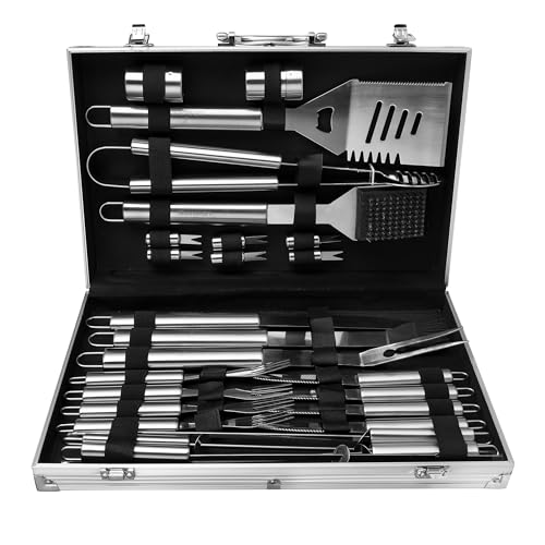Lehmann LGAGA-YAN006 Set d'ustensiles de barbecue dans un coffret, 26 accessoires de barbecue en acier inoxydable, accessoires de barbecue dans un coffret en métal, kit de barbecue de haute qualité,