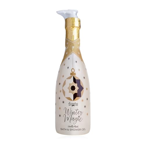 Gel douche Accentra WINTER MAGIC en flacon pompe, 460 ml, parfum Vanille Musquée, coffret cadeau blanc, or et noir, bien-être pour femme à Noël