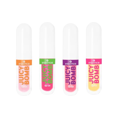 essence JUICY BOMB lip oil set JUICY BOMB PARTY, coffret de 4 huiles à lèvres, parfum tropical, cadeau pour des lèvres éclatantes, 4×2,4ml