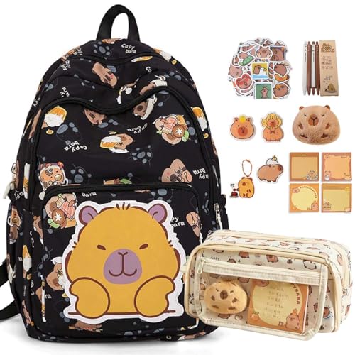 Dujuanus Sac à dos Capybara, Capybara Sac à dos en Dessin Animé, Sac D'école pour Enfants Kawaii Coffret Cadeau du Nouveau Semestre avec des Trousses (Black)