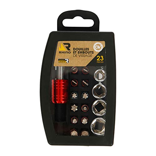 RHINO - Set d'embouts pour tournevis - Coffret d'embouts + douilles de vissage avec clip ceinture 23 pièces - Chrome vanadium - Bagues de couleur - Garantie 5 ans - Embouts PH, PZ, plats, torx, allen