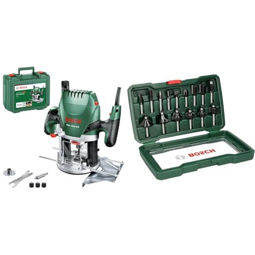 Bosch Home and Garden Défonceuse POF 1400 ACE - Livrée Avec Set d'Accessoires, Régulation Électronique Constante & Coffret de 15 Fraises au Carbure (Queue Ø 8 mm)