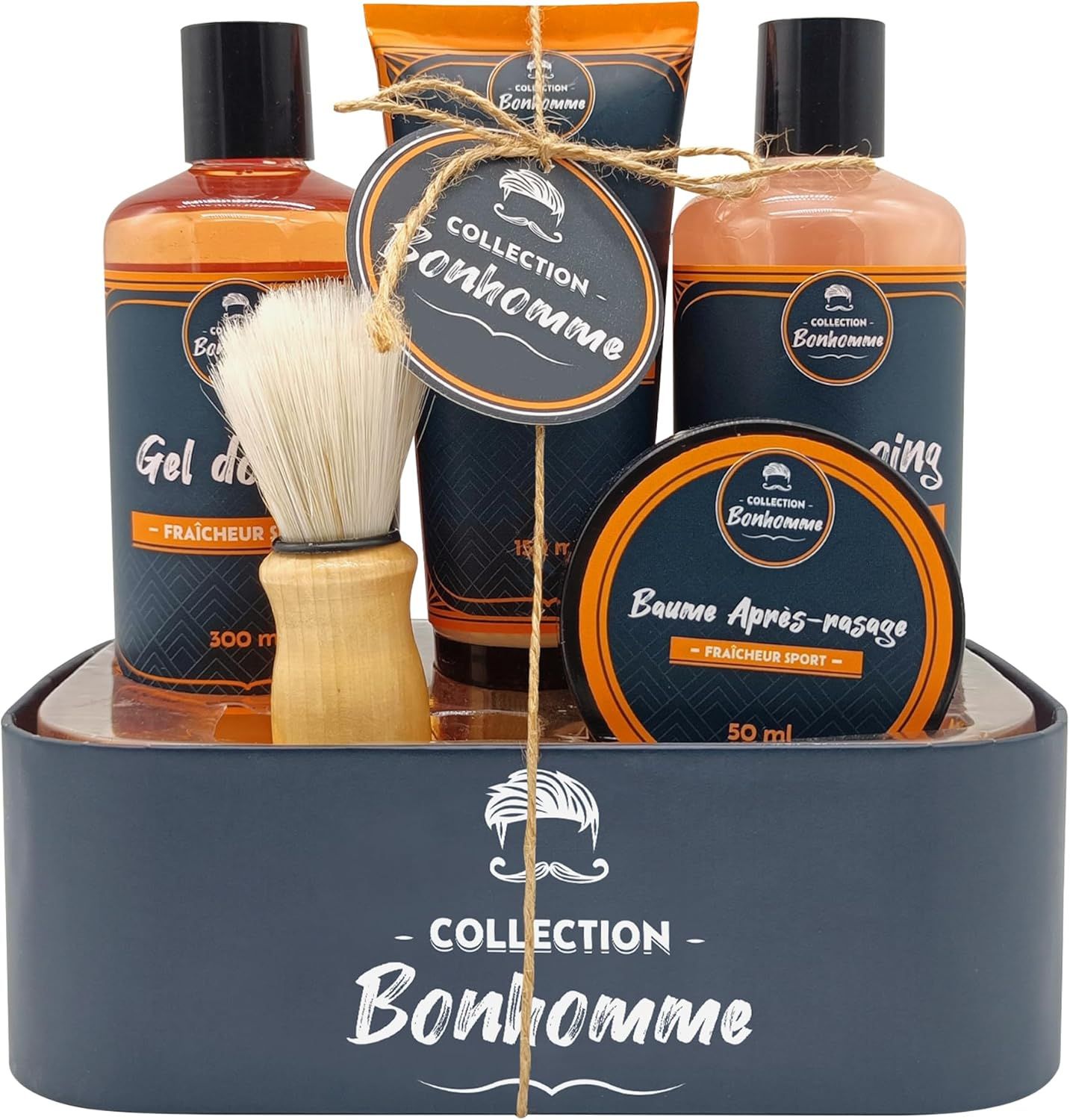French Tendance - Coffret Homme Douche - Kit Complet Gel Douche, Shampoing, Crème de Rasage, Blaireau, Baume Apres Rasage Homme - Soin Corps, Visage - Senteur Fraicheur Sport - Entretien Barbe