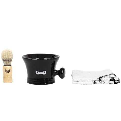 COSMETIC CLUB - SC29532 Coffret Entretien Barbe 3 Accessoires, Bol de Rasage Grès, Blaireau, Serviette, Format Compact 7,5x10,8x8 cm, pour Voyage, Homme, Noir