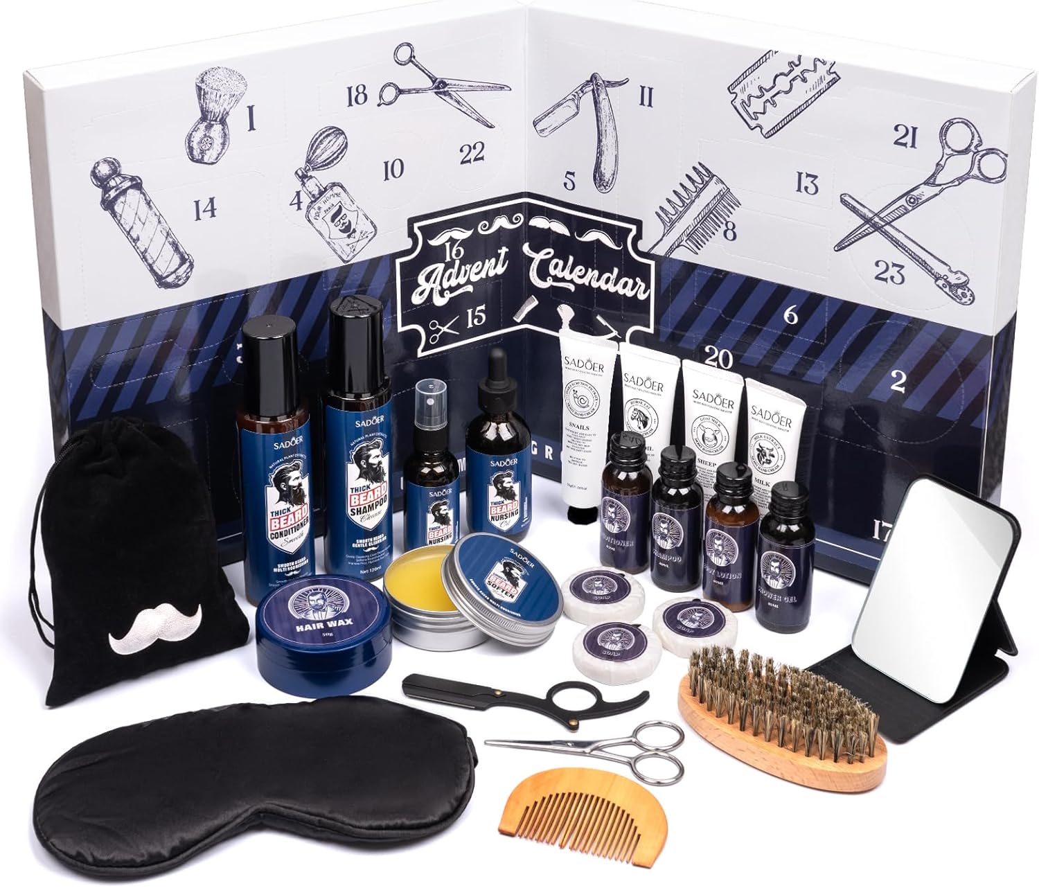 JEXNOVASHOP-Calendrier de l'Avent Homme 2025, 24pcs Coffret Cadeau de Noël pour les Soins de Barbe, Cheveux, Visage et Corps, Kit Soins Barbe pour Homme, Calendrier de l'Avent Beauté