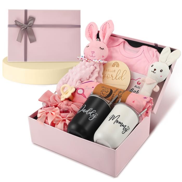 TUZT Coffret Cadeaux de Naissance Fille, Cadeau pour Bebe Fille avec Grenouillere Bebe Chaussettes Couverture Lapin Hochet Carte Etape Boîte en Bois Cadeau Baby Shower pour Nouveau Né