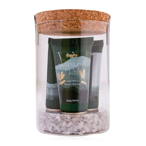 Coffret de bain Accentra WINTER SPA dans un verre décoratif avec couvercle en liège, comprenant gel douche, lotion pour le corps, crème pour les mains et crème pour les ongles, cadeau femme Noël