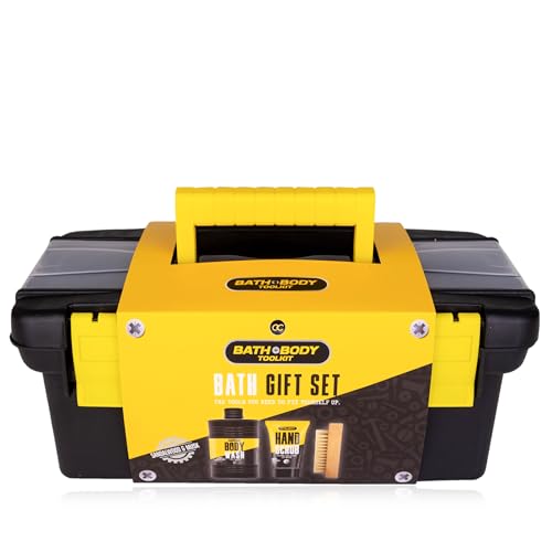 Accentra Coffret cadeau Bath + Body Toolkit pour homme, gel douche 400 ml, gommage pour les mains 50 ml et brosse à ongles en bois emballés dans une mallette à outils cool
