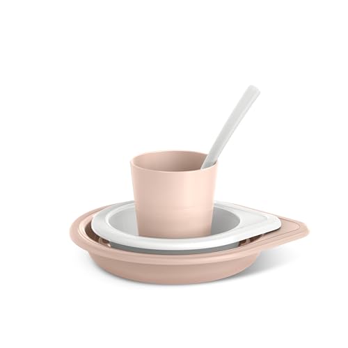 Suavinex, Set Vaisselle Bébé. Coffret Repas Enfant, 5 pièces. Comprend : Assiette + Bol + Tasse + Cuillère + Nappe Antidérapante. 6+ Mois. Durable, Apte pour le lave-vaisselle, Micro-onde. Rose