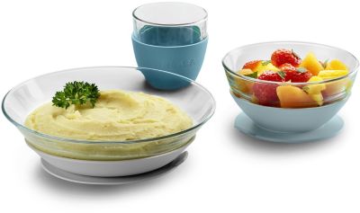 BÉABA & Duralex, Coffret Repas Enfant en Verre, Assiette, Bol, Verre avec Ventouse Silicone, Ergonomique, Evolutif, Sain, Durable, Made in France, Eucalyptus