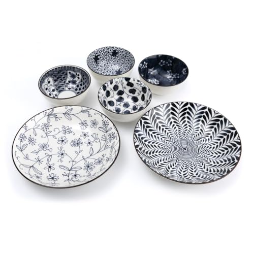 lachineuse - Coffret Repas Japonais - 2 Asiettes Creuses ⌀ 21 cm & 4 Bols à Riz ⌀ 11,5 cm - Style Asiatique Fleurs - Coloris Bleu & Blanc - Vaisselle Japonaise Traditionnelle Zen - Idée Cadeau Japon