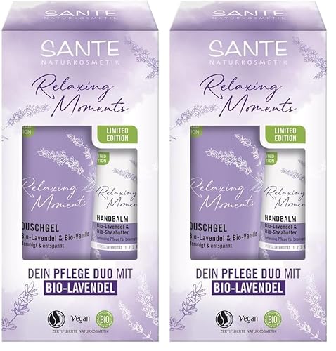 SANTE Naturkosmetik Coffret cadeau lavande édition limitée (X-Mas), duo de soin relaxant à la lavande bio et à la vanille, idéal comme cadeau de Noël, gel douche 200 ml et baume pour les mains 75 ml