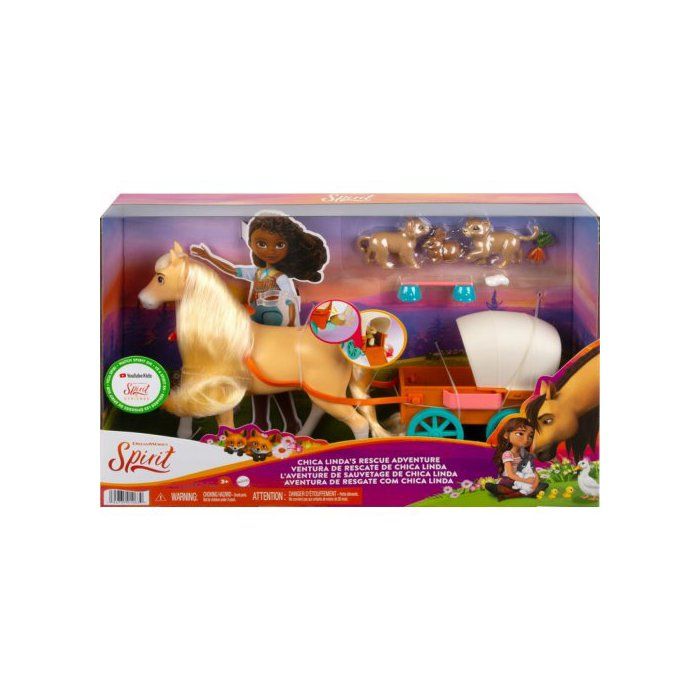 Coffret Spirit : Jument Chica Linda et Cheval Brun avec Sa Carriole et Animaux et Accessoires - Set Jouet Fille Et 1 Carte