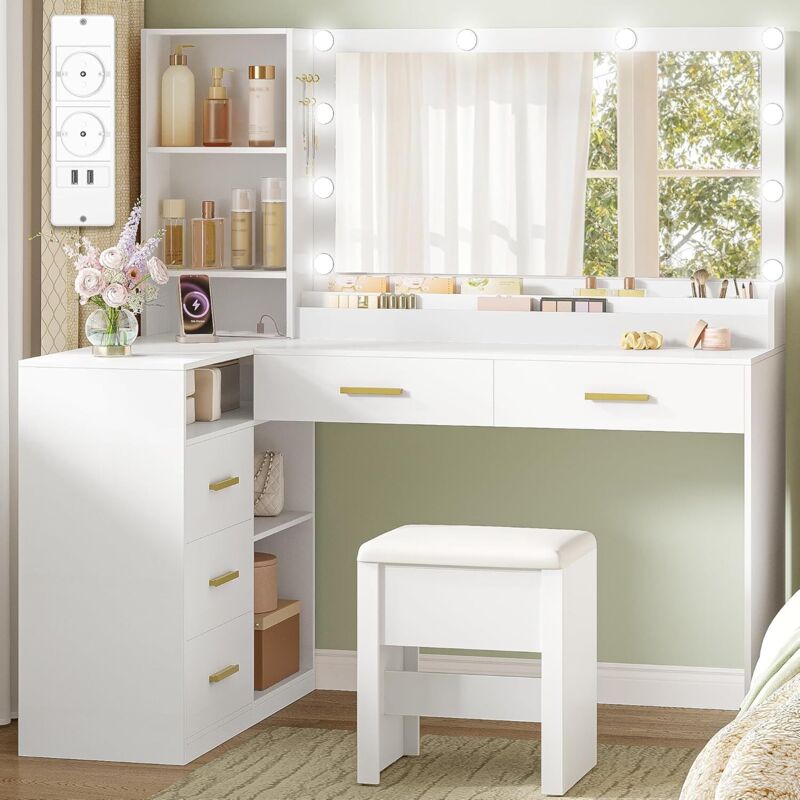 Coiffeuse avec grand miroir led et tabouret,luminosité réglable, table de maquillage en l avec prise