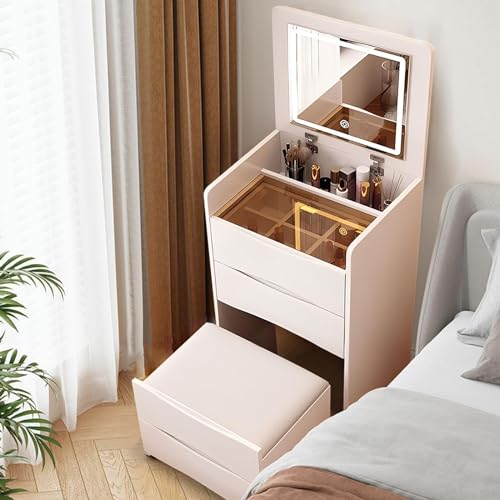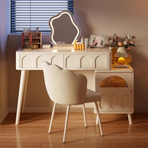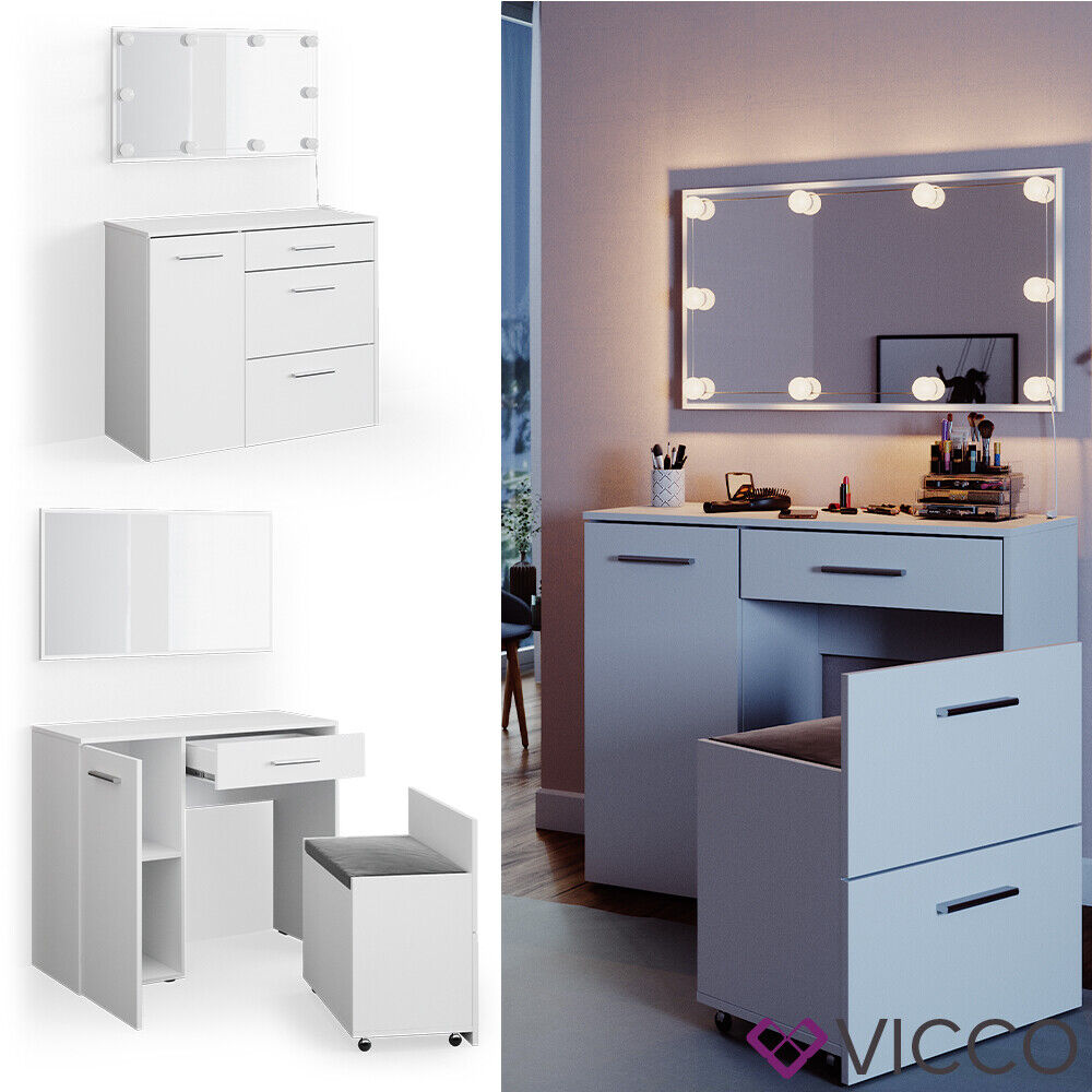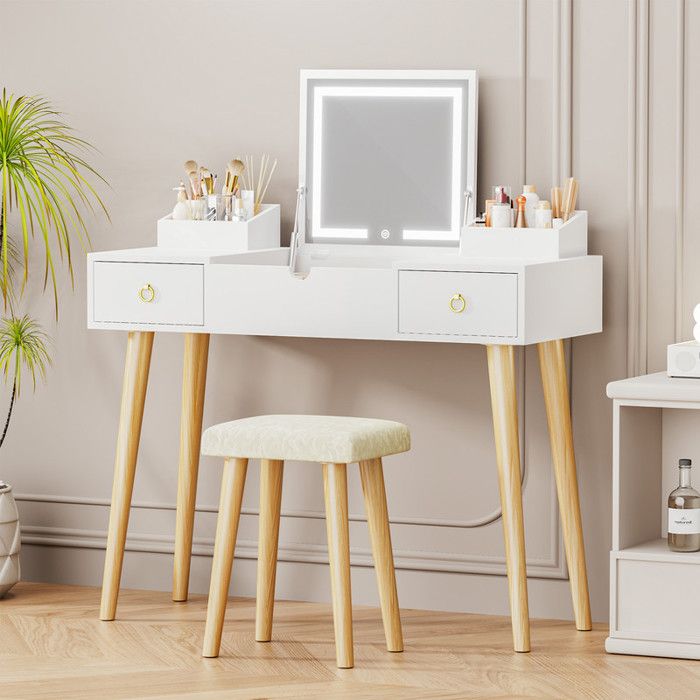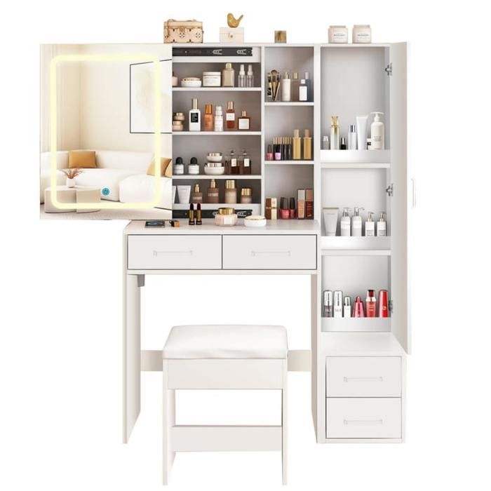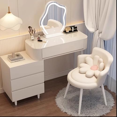 Coiffeuse blanche avec miroir led, tabouret et 3 tiroirs, design moderne, meuble de chambre pratique