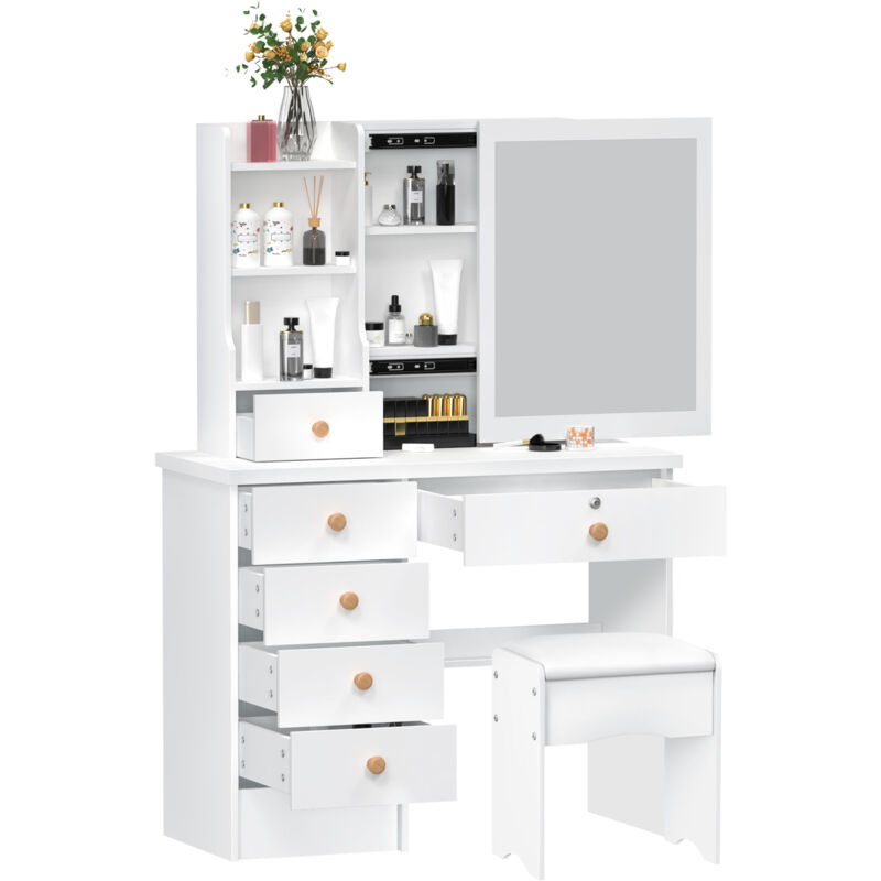Flasidu - Coiffeuse avec chaise, miroir coulissant, 6 tiroirs et 5 étagères, blanc, 80cmx40cmx135cm.