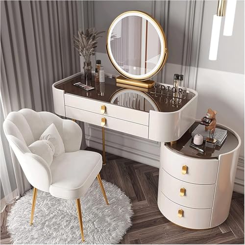Coiffeuse Moderne Et élégante avec Plateau en Verre, Ensemble De Maquillage avec Armoire Latérale Et Chaise, Coiffeuse avec Miroir éclairé Et Tiroirs