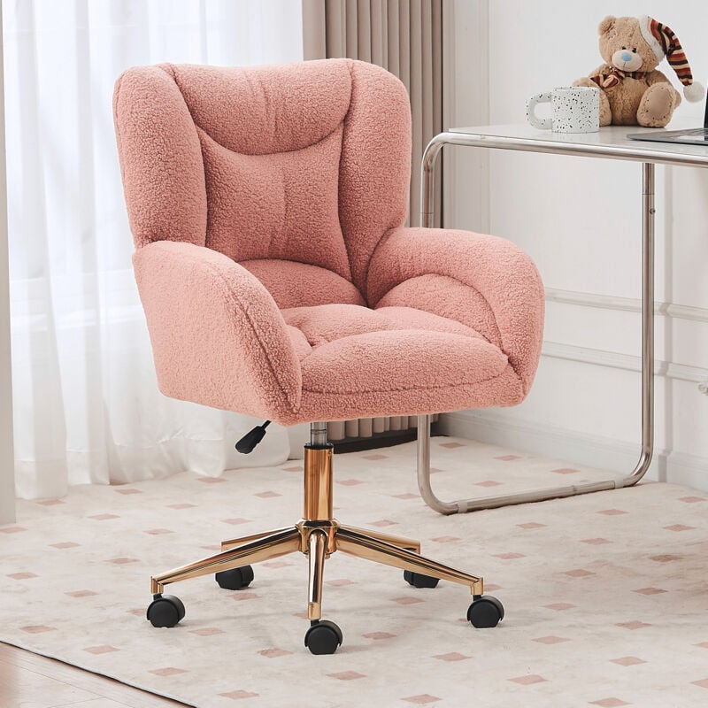 Fauteuil de bureau pivotant, chaise coiffeuse, tissu teddy, hauteur réglable, roulettes 360°, pieds métal doré, rose