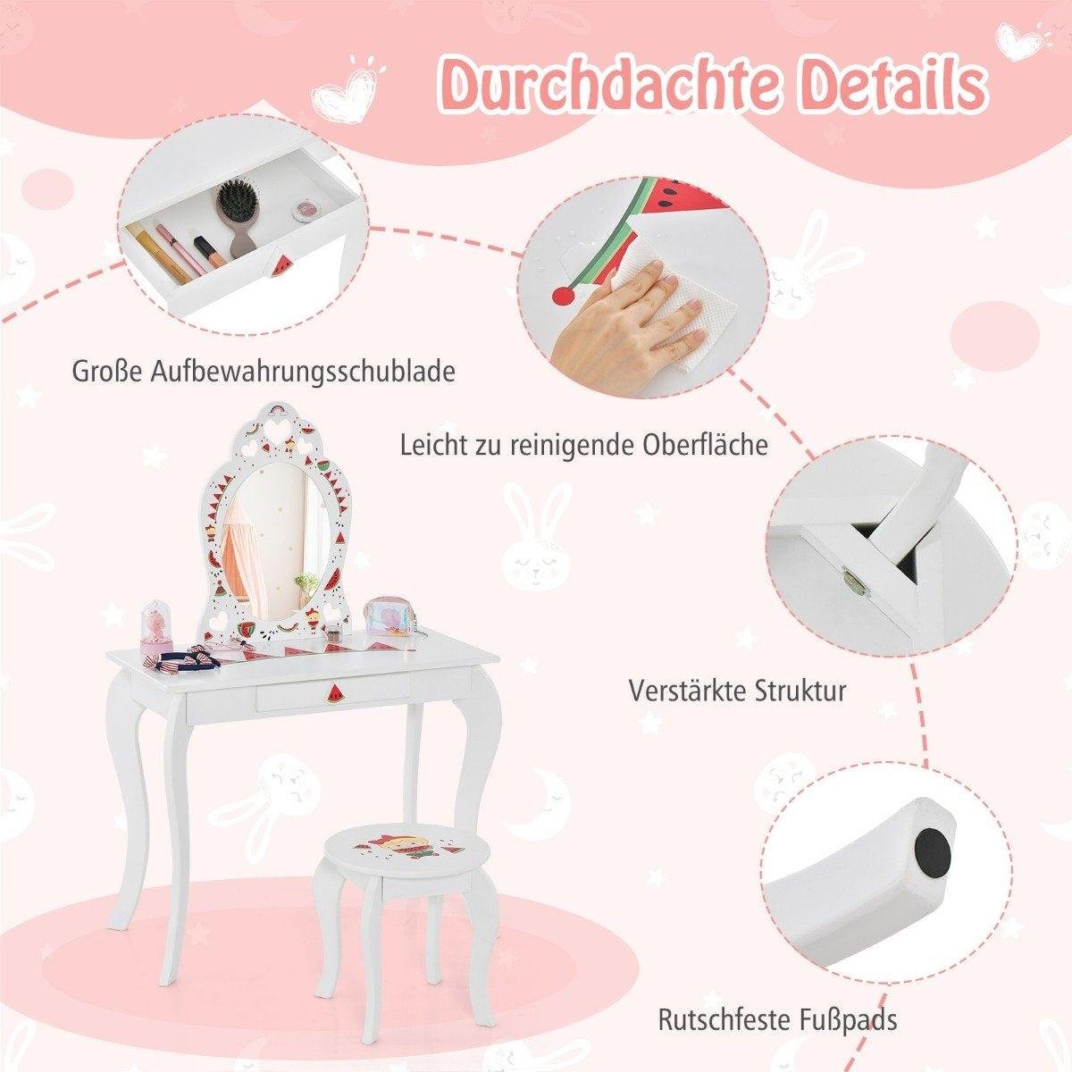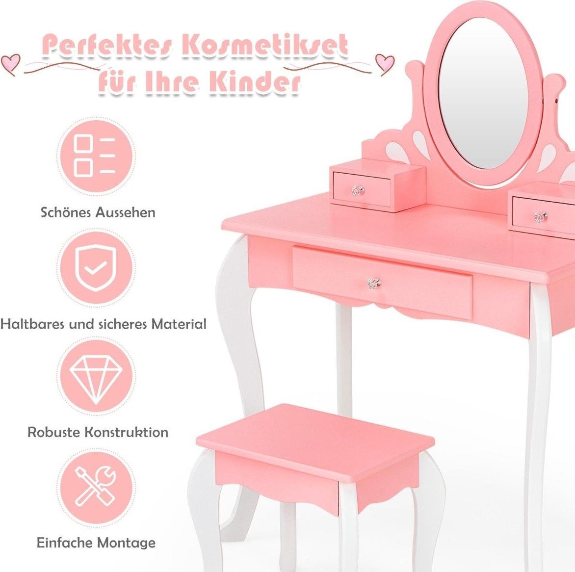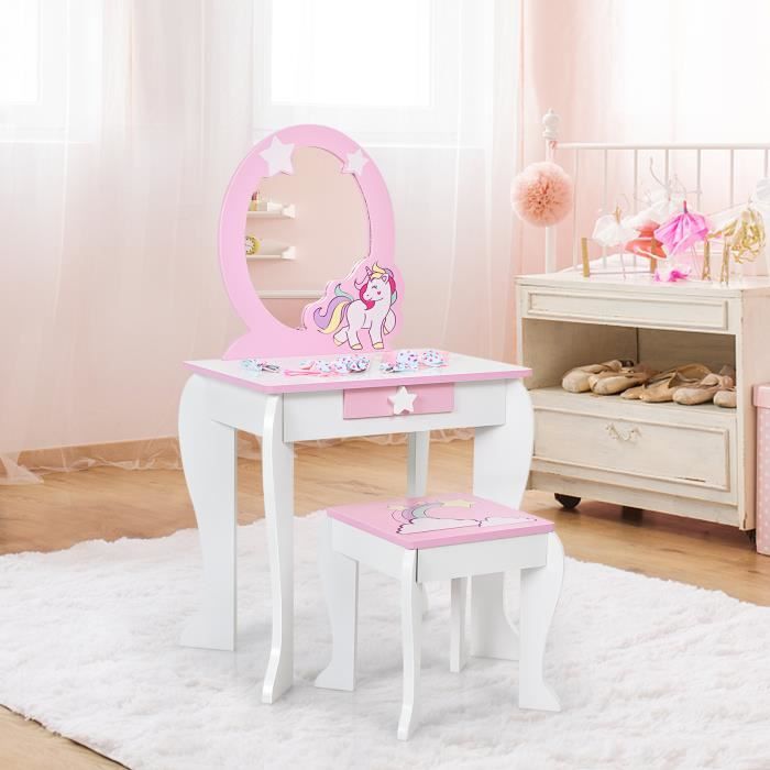 COSTWAY Coiffeuse pour enfants avec tabouret, Coiffeuse princesse avec tiroirs miroir & boîte de rangement, Coiffeuse maquillage pour enfants filles